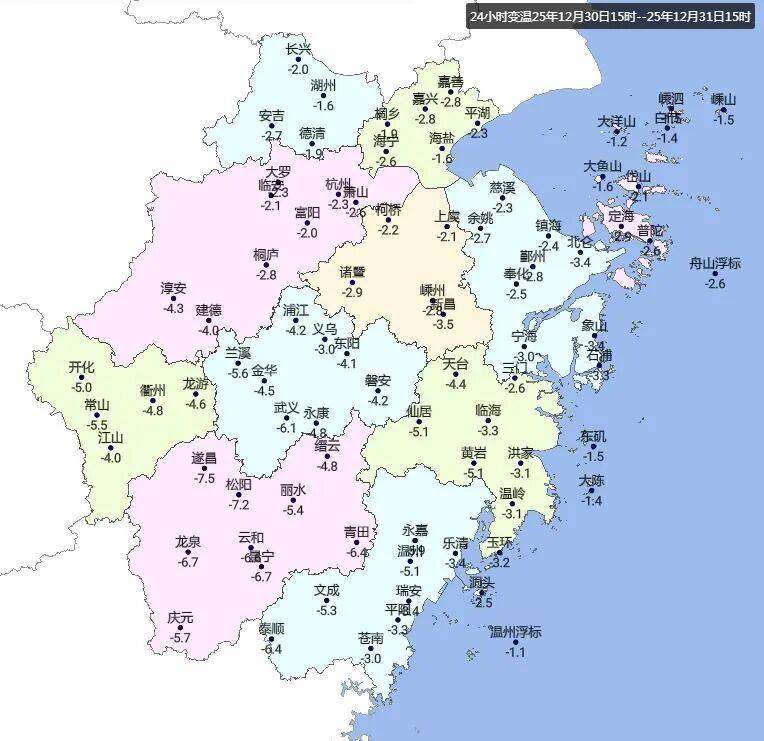 虽然冷空气主体还没全面抵达浙江,但是它的先遣部队已经给我们带来了影响。昨天15点,我省气温较前天同一时段有不同程度下降,24小时变温普遍在2-5℃之间,浙南更直观,普降5-7℃。