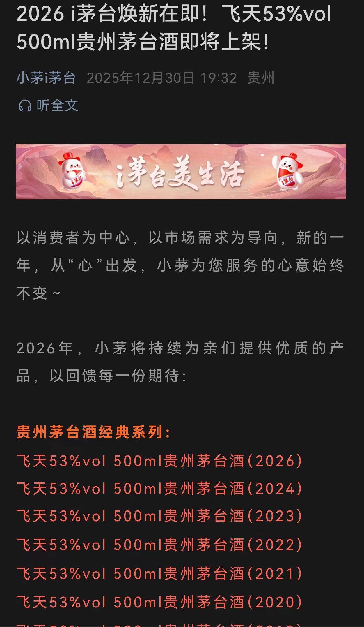 12月30日晚,i茅台官方正式宣布,2026年将调整贵州茅台酒上架产品矩阵,主要有经典、精品、生肖、陈年、文化、低度酒等六大系列,涵盖53%vol 500ml飞天贵州茅台酒等多款茅台酒产品。