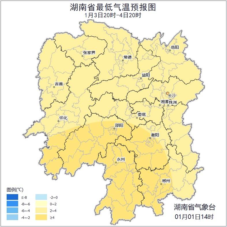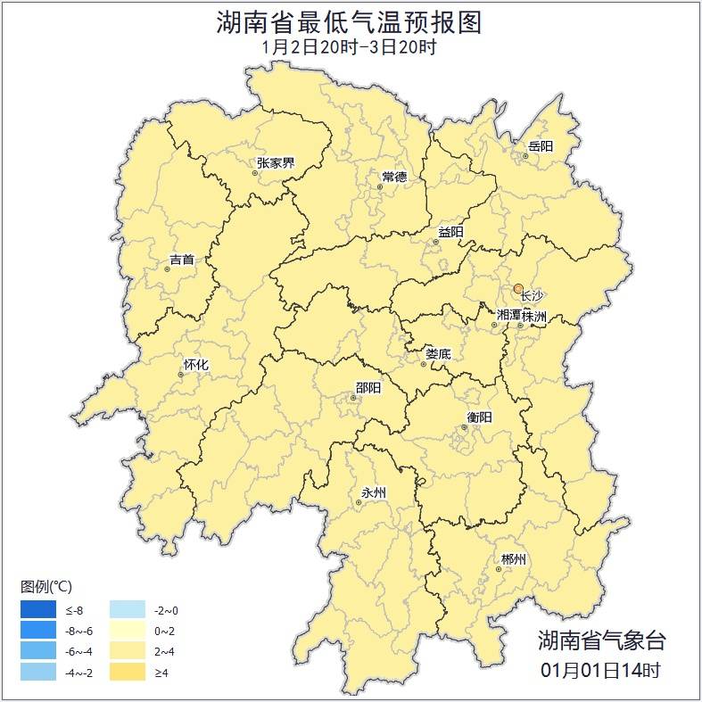 1月1日晚上至2日白天,全省多云间晴天;北风2~3级,局地阵风5级;最低气温湘中以北-1~1℃,其他地区2~4℃;最高气温8~11℃。