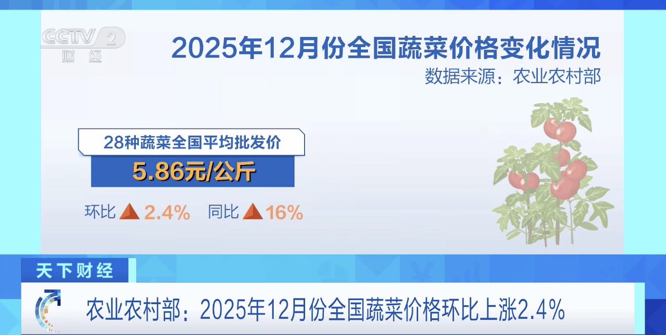 2025年12月份,农业农村部监测的28种蔬菜全国平均批发价为每公斤5.86元,环比上涨2.4%,同比上涨16%。环比价格涨幅比较大的品种包括西红柿、冬瓜、西葫芦。