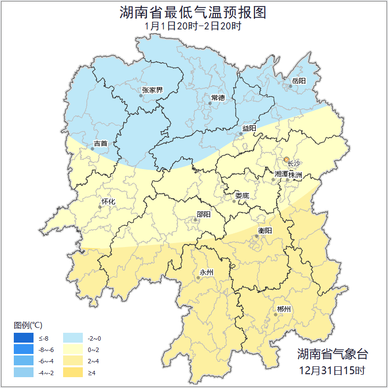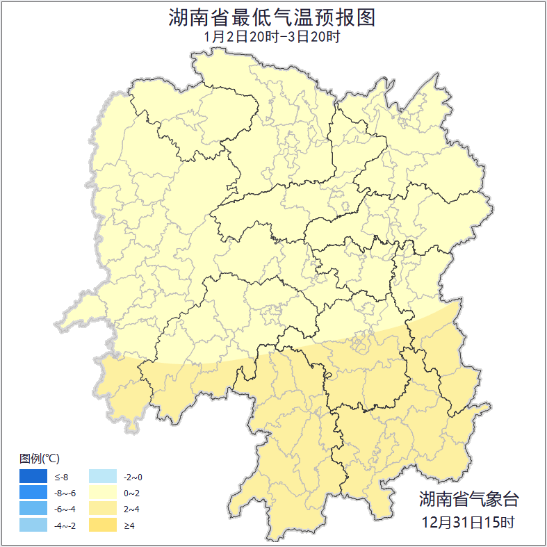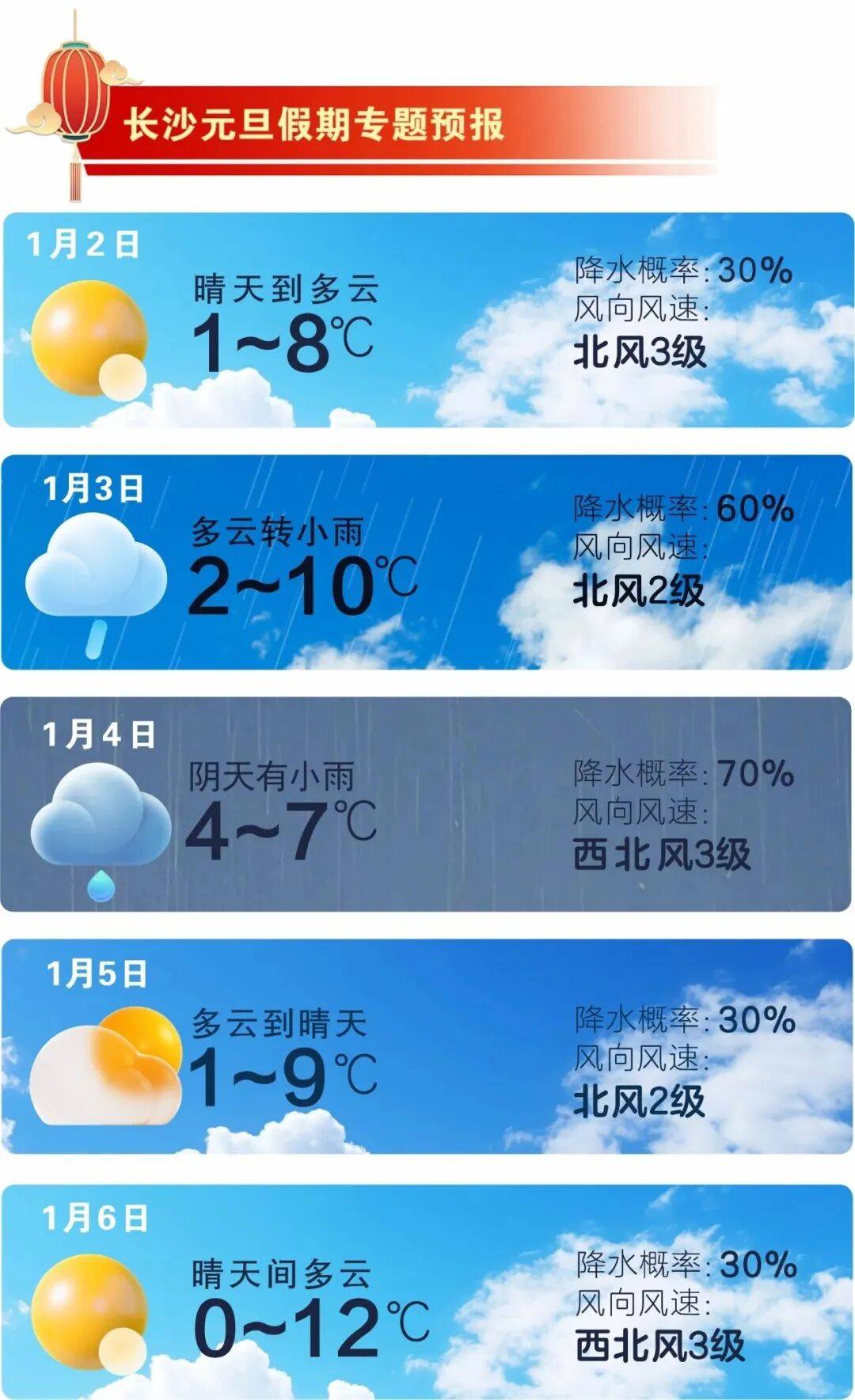 1月2日白天,多云间晴天;北风3级,局地阵风5级;最低气温湘中以北-1~1℃,其他地区2~4℃;最高气温7~9℃。