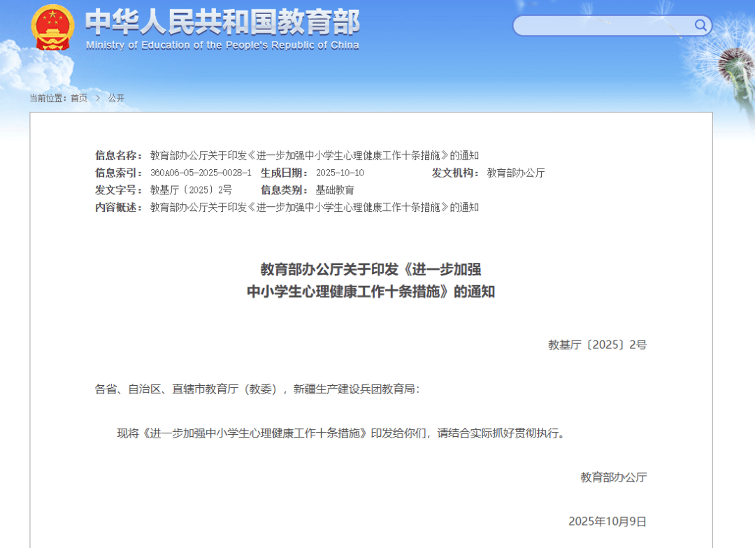 10月出台的《进一步加强中小学生心理健康工作十条措施》,则从另一个角度入手,缓解考试焦虑、保障睡眠、加强体育、健康用网、改善亲子关系等,系统构建心理防护网。