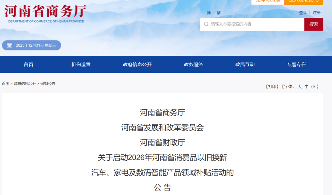 12月31日,我省就2026年河南省消费品以旧换新汽车、家电及数码智能产品领域补贴发出公告。全文如下:
