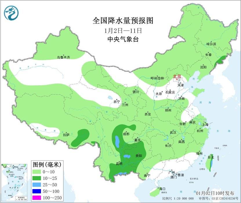 未来10天(2026年1月2-11日),西北地区东南部、东北地区东部、江汉西部、江南西部、华南西部及西南地区东部累计降水量有3~6毫米,其中吉林东部、四川盆地、贵州、广西西部、云南东部、台湾岛东部等地的部分地区有8~15毫米,局地20毫米以上;上述大部地区累计降水量较常年同期偏多3~6成,局地偏多1倍以上,我国其余大部地区降水偏少。