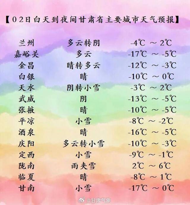 今天夜间到明天白天(1月2日20时-1月3日20时),甘南、定西、陇南、天水、平凉、庆阳等州市阴有小雪或雨夹雪;兰州、白银、临夏三市州多云,局部地方阴有小雪或阵雪;省内其余地方晴或多云。