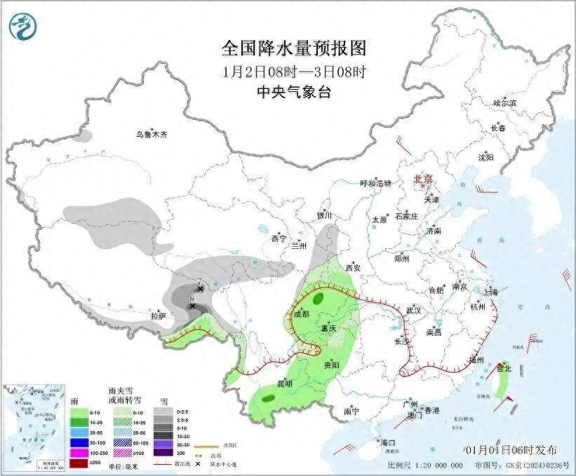 中央气象台预计,1月2日,新疆南疆高海拔山区、西藏北部、青海南部、甘肃东部和南部、宁夏南部、陕西南部、川西高原北部、贵州西北部等地部分地区有小雪或雨夹雪,其中,西藏东部等地部分地区有中到大雪。西藏东南部、西南地区东部和南部、台湾岛等地部分地区有小雨,局地中雨。