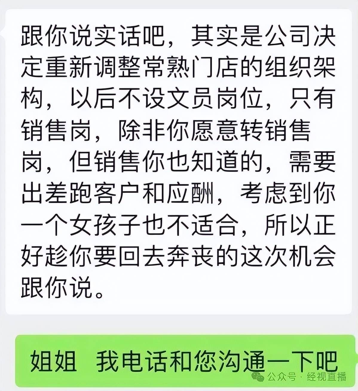 李女士提到,总公司法人曾来过她所在分公司视察,并且和她谈过,希望她能从文员转岗销售,李女士没有答应。在人事要求她自动离职时,也提到文员转岗销售李女士不适合,“所以趁你要回去奔丧的机会跟你说。”