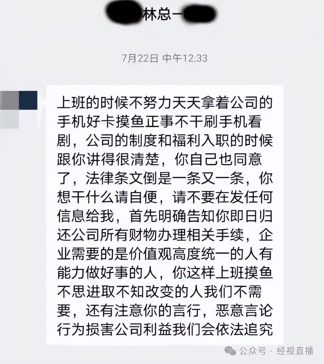 关于李女士请假事宜,林先生没有正面回答,继续强调李女士上班摸鱼,“不要扯丧假前丧假后,谁规定她奶奶去世有丧假的。我就是要开除她,不管在什么时候,不要跟我讲什么奶奶过世爷爷过世,谁爷爷奶奶不过世,这些都是有的没的,虚头巴脑。”