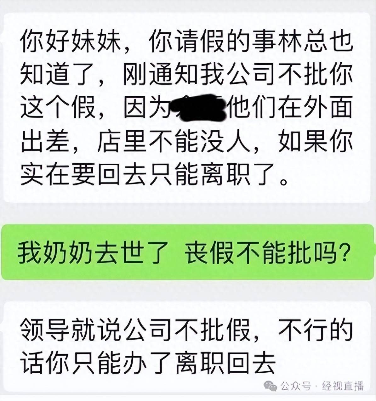 李女士告诉记者,她在常熟市一家公司做了一年多的文员工作,公司总部在苏州。2025年7月,奶奶去世,李女士向经理申请了5天事假,取得经理和人事的同意后,她才买票回家。当天她坐上了回家的高铁,然而在车上她收到了人事的消息,总公司法人不批准,她只能自己离职才可以回家。