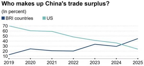 “一带一路”共建国、美国在中国贸易顺差中占比趋势。《日经亚洲》制图