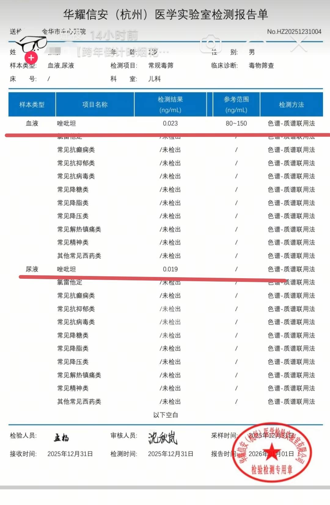 徐女士一家人随后报警。据金华市中心医院的检测报告显示,小孩血液及尿液中均含“唑吡坦”成分。