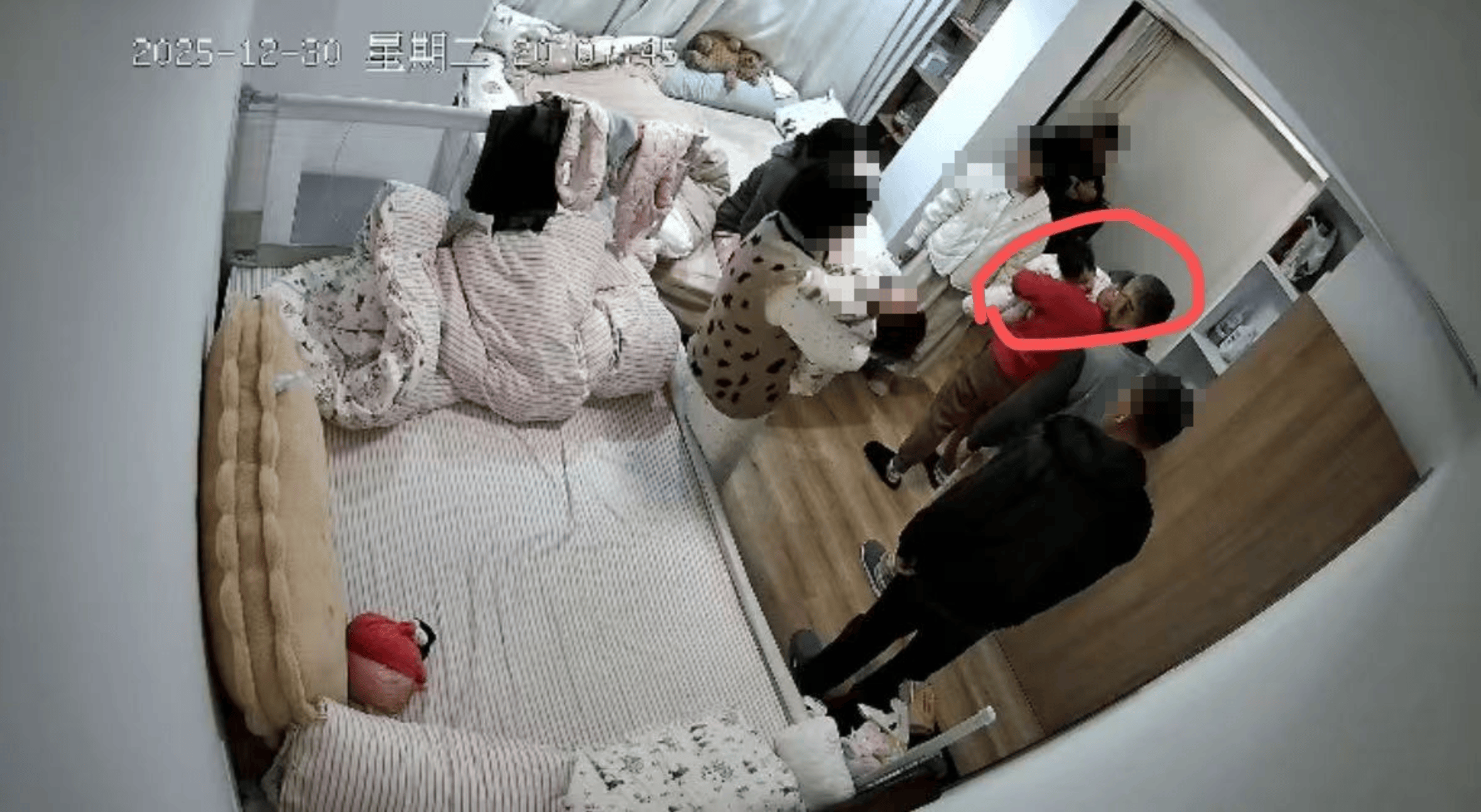 徐女士提供的家中监控视频显示,12月30日晚7时38分许,保姆称要哄宝宝睡觉,随后关上房门和灯,走至一角落处。孩子父亲随后进来发现不对劲,接过孩子抱至徐女士处确认状态。