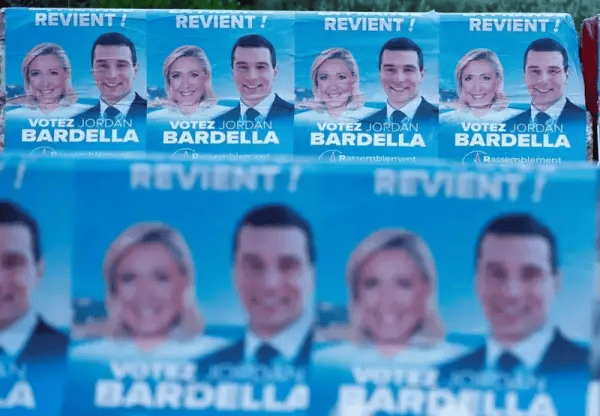 法国极右翼“国民联盟”的选举海报,上面有其领导人玛丽娜·勒庞和乔丹·巴尔德拉的照片。资料图:路透社
