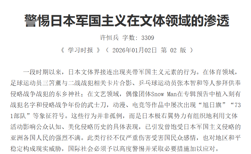 2026年1月2日出版的《学习时报》在第2版刊发国防大学政治学院马克思主义理论系副主任许恒兵的文章《警惕日本军国主义在文体领域的渗透》。