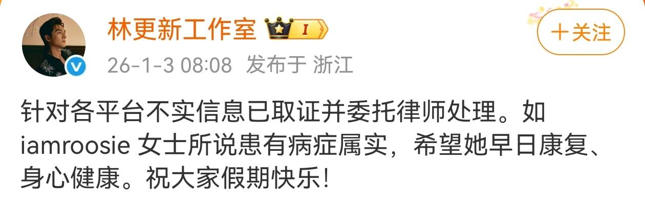 林更新工作室发文回应:“针对各平台不实信息已取证并委托律师处理。”