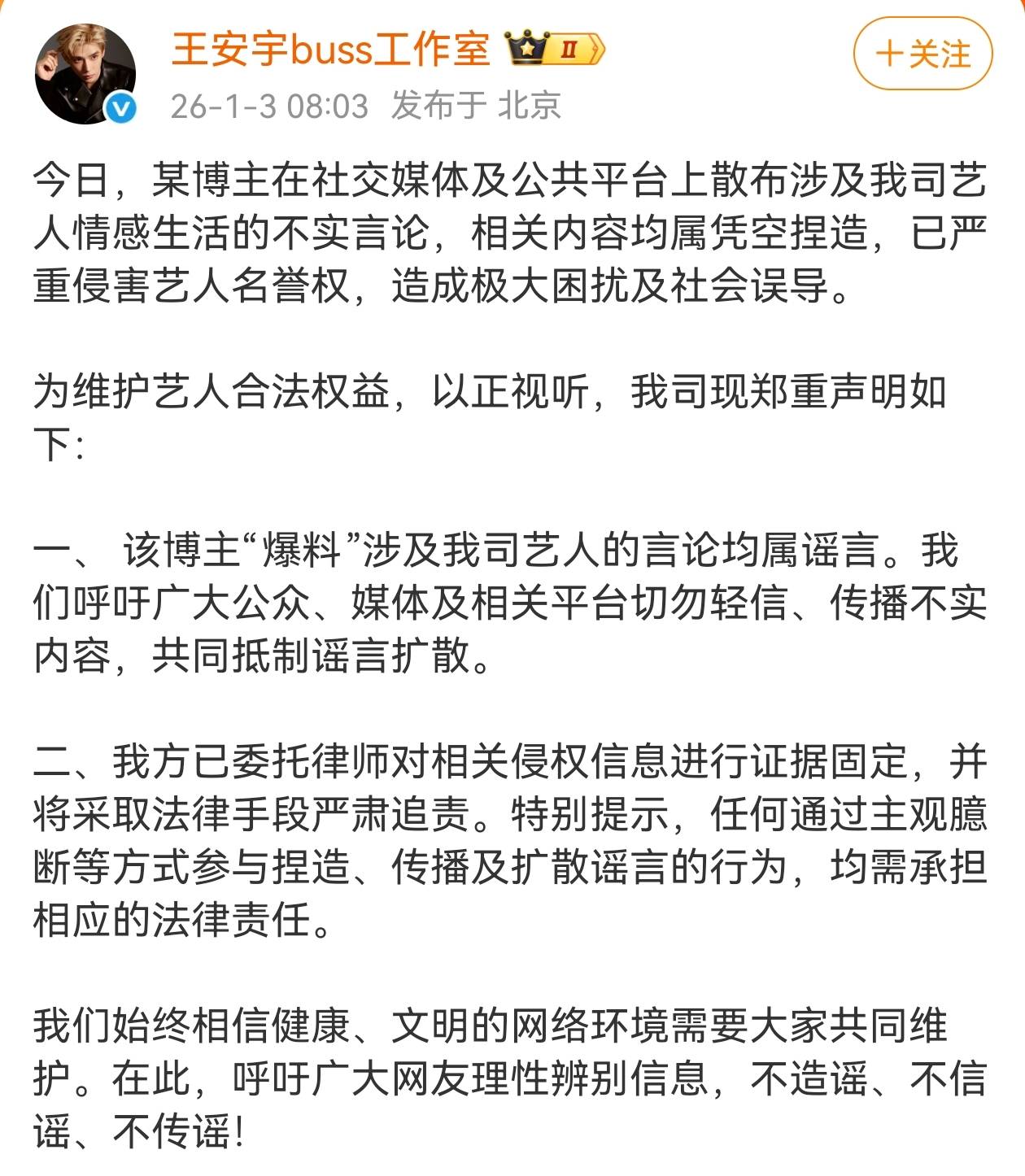 王安宇工作室也发文否认:“某博主在社交媒体及公共平台上散布涉及我司艺人情感生活的不实言论,相关内容均属凭空捏造,已严重侵害艺人名誉权,造成极大困扰及社会误导。”