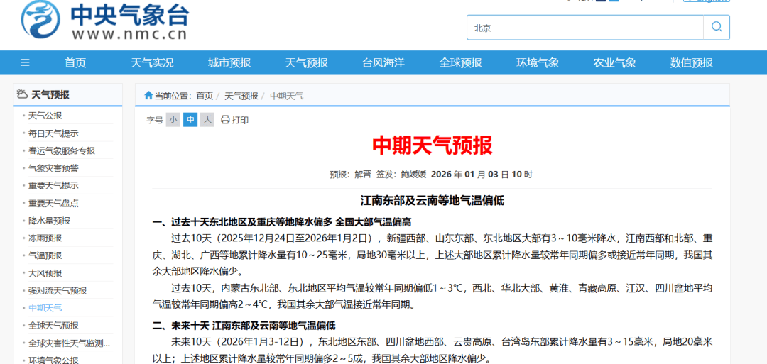 另,1月3日10时,中央气象台发布中期天气预报,其中提及未来10天,影响我国的冷空气势力不强,但活动频繁,江南东部、华南东部和南部及 云南等地平均气温较常年同期偏低1~2℃。