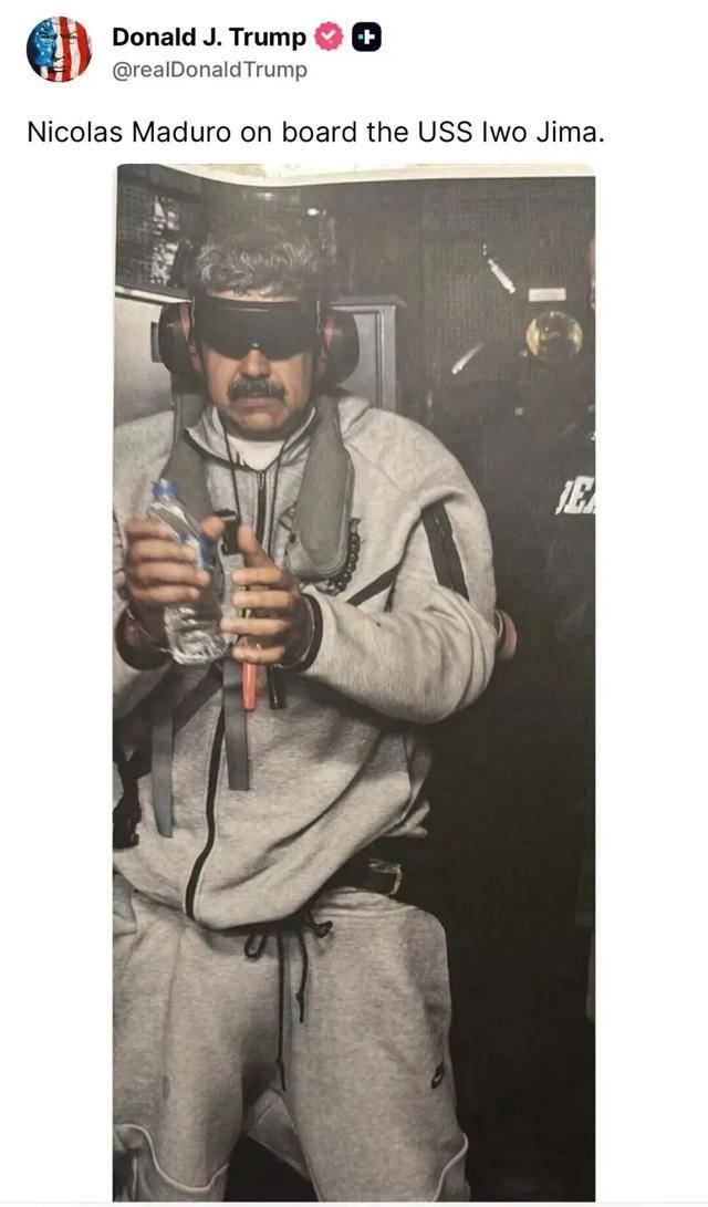 据新华社、央视新闻报道,当地时间1月3日,特朗普在其社交平台Truth Social上发布了一张马杜罗在“硫磺岛”号军舰上的照片。