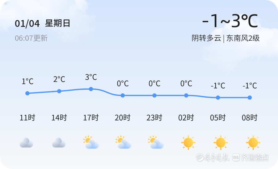 今天是2026年1月4日,农历十一月十六,星期日。聊城市的天气为阴转多云,气温在-1℃到3℃之间,东南风2级,空气湿度为75%,PM2.5指数为120。目前温度为1.2℃,整体天气较为阴沉,市民出行需注意保暖和防风。