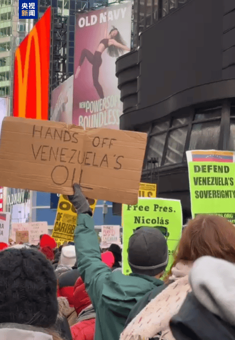 在纽约,人们聚集在时代广场的美国陆军征兵办公室外,手持反对对委内瑞拉开战的标语。