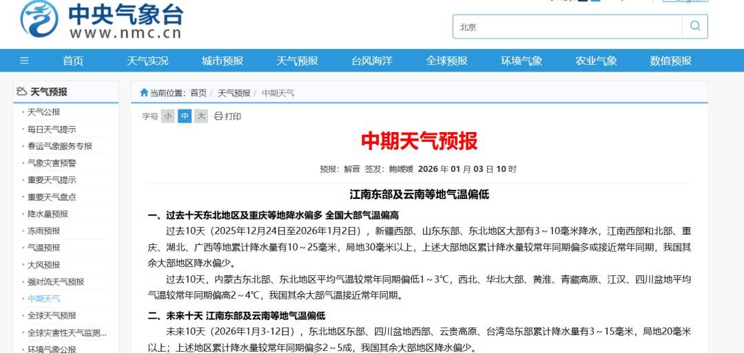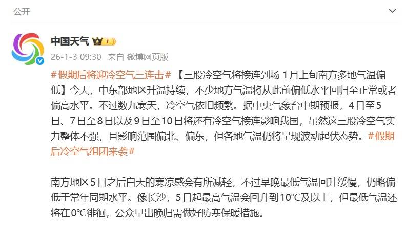 另,1月3日10时,中央气象台发布中期天气预报,其中提及未来10天,影响我国的冷空气势力不强,但活动频繁,江南东部、华南东部和南部及云南等地平均气温较常年同期偏低1~2℃。