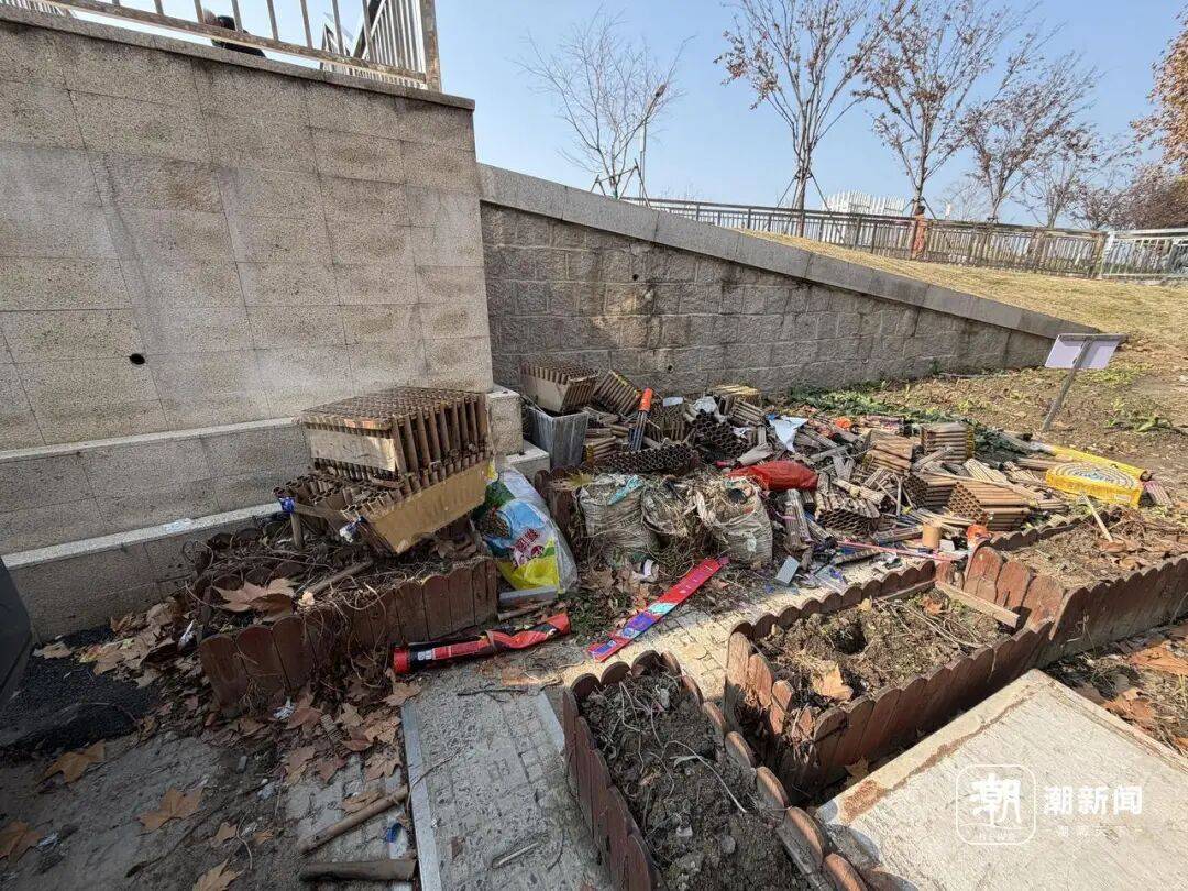 闻堰老街入口处有一处通往海塘的台阶通道。1月3日,记者在这里观察到,通道附近仍堆放着不少烟花的废弃包装。其中不乏一些发数较多的大型烟花,还有仙女棒一类的玩具烟花。