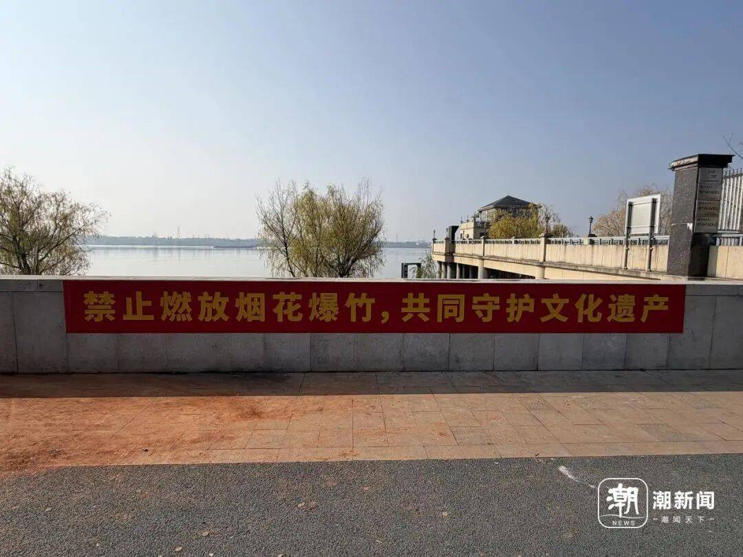 沿着台阶而上,海塘上已拉起一条长横幅“禁止燃放烟花爆竹,共同守护文化遗产”。虽然是白天,但记者仍能闻到一股烟花硫黄的气味,草丛中能看到些许烟花的包装。特别是在横幅下,部分地面呈现焦黄的颜色,有些位置已被熏黑。