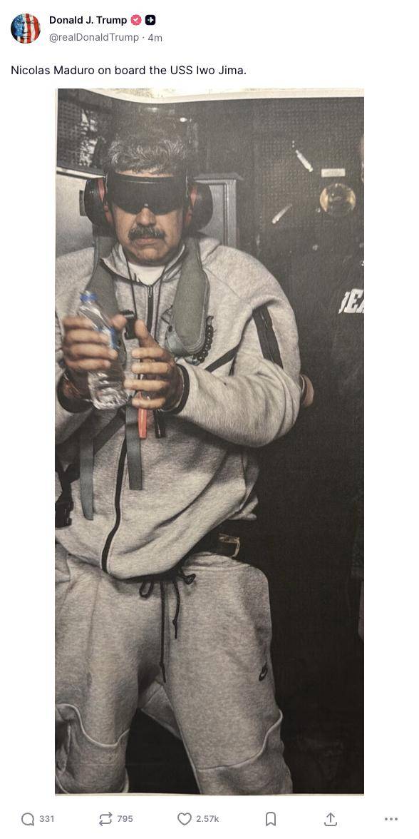 美国总统特朗普3日在社交媒体上发布委内瑞拉总统马杜罗在美国军舰上戴手铐、双眼被黑布蒙住的照片。“尼古拉斯·马杜罗在美国军舰‘硫磺岛’号上。”特朗普在帖文中写道。