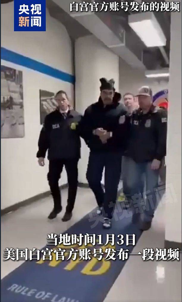 据央视新闻,当地时间1月3日,记者获悉,美国白宫官方账号发布了一段视频,记录了疑似马杜罗被押送抵达美国缉毒署(DEA)办公室的画面。视频显示,马杜罗身穿黑色连帽运动衫,走在一条铺着蓝色地毯的走廊里,地毯上标有“DEA NYD”字样。