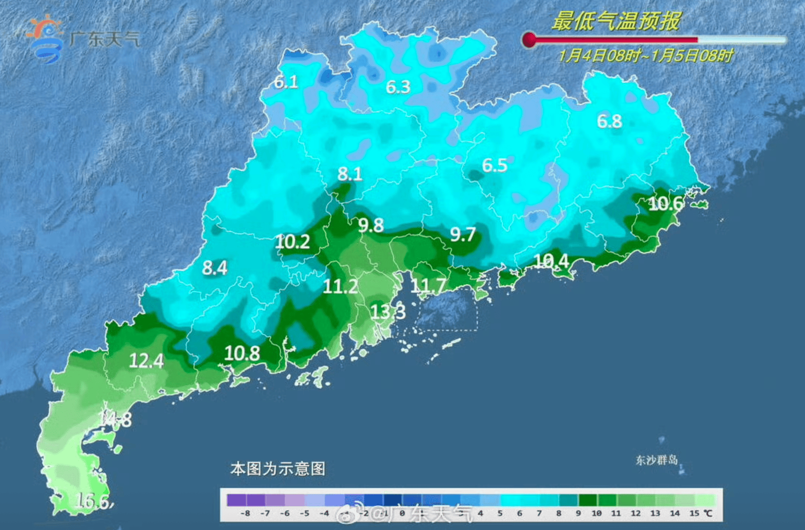 6日,全省大部晴间多云,昼夜温差大,早晚寒冷。最低气温:粤北、珠三角北部市县2-5℃,其中高海拔山区零下2℃至1℃,有霜冻和冰冻,粤西沿海市县10-14℃,其余市县6-10℃。