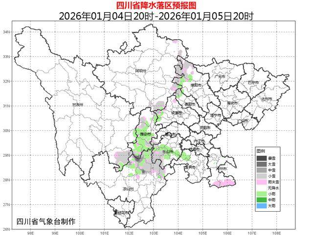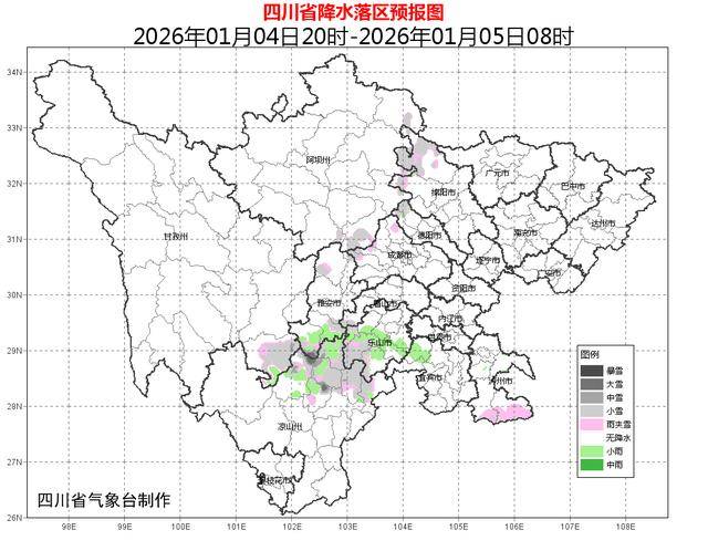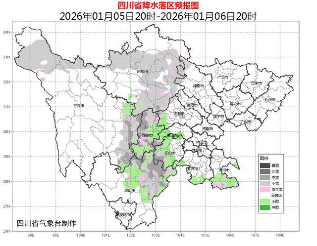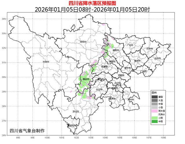 5日晚上到6日白天:盆地西南部南部阴天间多云有零星小雨,高海拔地区有雨夹雪或雪,局地中雪,其余地方多云,北部局部地方早上有霜冻;甘孜州西北部东部、阿坝州中部南部及凉山州东北部阴天间多云有阵雪(雨),局地中到大雪,川西高原和攀西地区其余地方多云到晴。