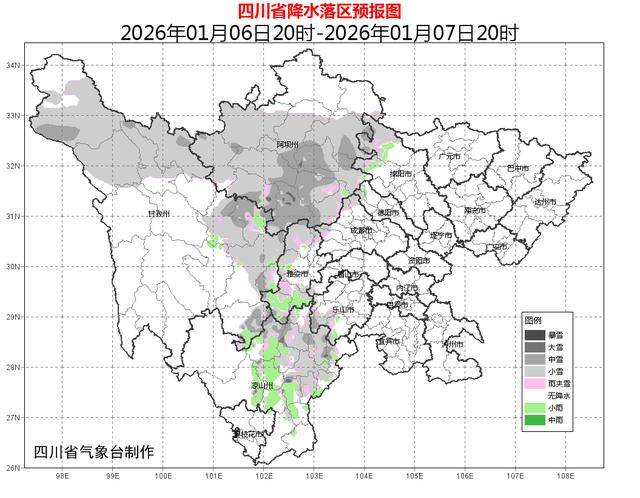 6日晚上到7日白天:盆地西部沿山阴天间多云有零星小雨,高海拔地区有雨夹雪或雪,其余地方多云,北部局部地方早上有霜冻;甘孜州北部东部、阿坝州中部南部及凉山州东北部阴天间多云有阵雪(雨),局地中到大雪,川西高原和攀西地区其余地方多云到晴。