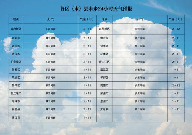 24小时内,盆地最低气温:北部-1~2℃,其余地方2~4℃,最高气温:11~13℃。今天晚上:盆地西部南部沿山阴天有零星小雨,高海拔山区有雨夹雪或雪,其余地方多云间晴,局部地方有雾,北部局地有霜冻;甘孜州东南部、阿坝州东部及凉山州东北部阴天间多云有阵雪(雨),局地中雪,川西高原和攀西地区其余地方多云到晴。