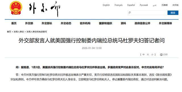 问:据报道,1月3日,美国派兵强行控制委内瑞拉总统马杜罗夫妇并移送出境。多国政府发声对此表示反对。中方对此有何评论?