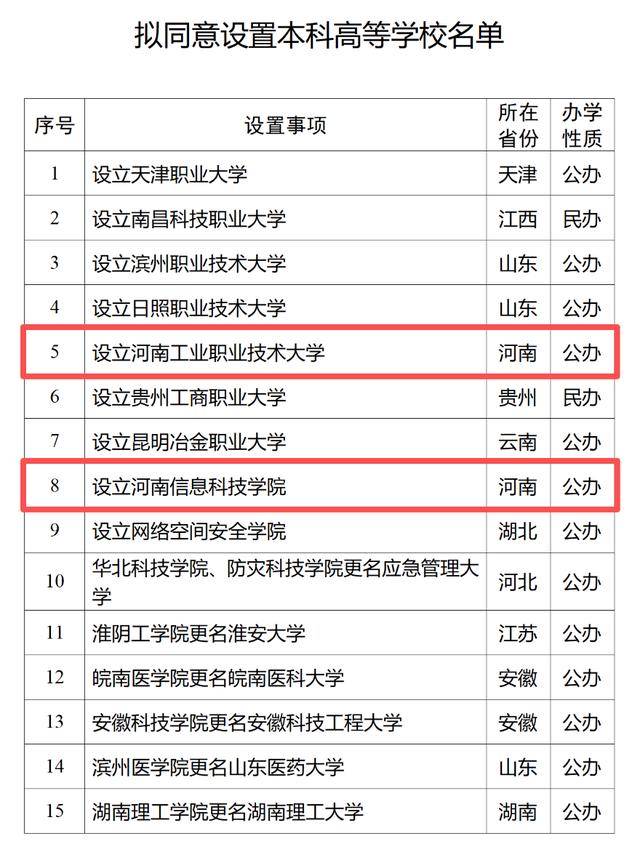 教育部公示,河南设置2所公办本科高校