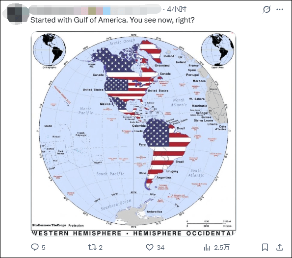 还有一名网民写道:“从‘美国湾’(即墨西哥湾)开始。现在你们明白了吧?”而这名网民所配的地图上,整个美洲都被覆盖上了美国国旗的图案。