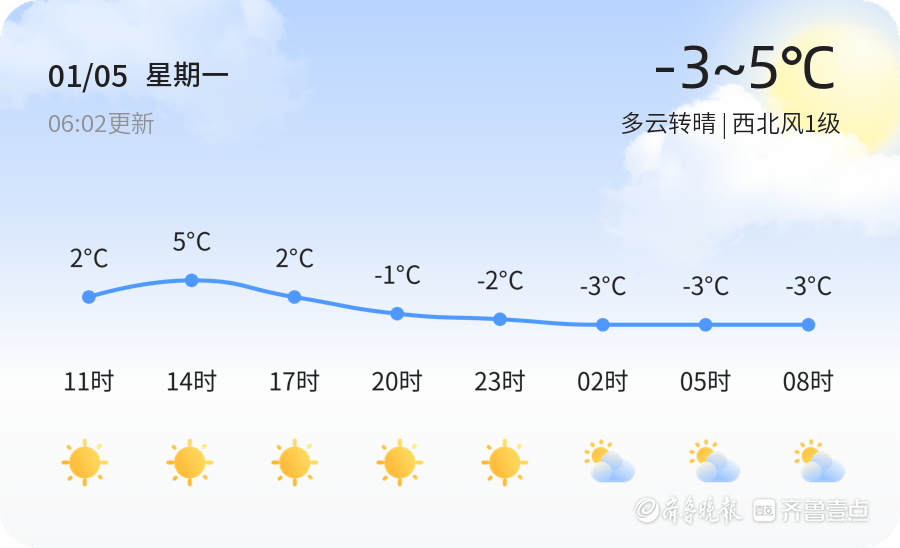 今天是2026年1月5日,农历十一月十七,也是二十四节气中的小寒。东营市今日天气多云转晴,气温较低,最高气温5℃,最低气温-3℃,西北风1级,空气湿度95%。PM2.5指数为65,空气质量等级为良。今日气温较低,市民出行请注意保暖,适时增添衣物。此外,今日为小寒节气,标志着冬季寒冷正式开始。小寒期间,天气寒冷,市民需注意防寒保暖,避免感冒。同时,今日早晨部分地区可能出现大雾,能见度较低,驾车出行请注意安全,减速慢行。