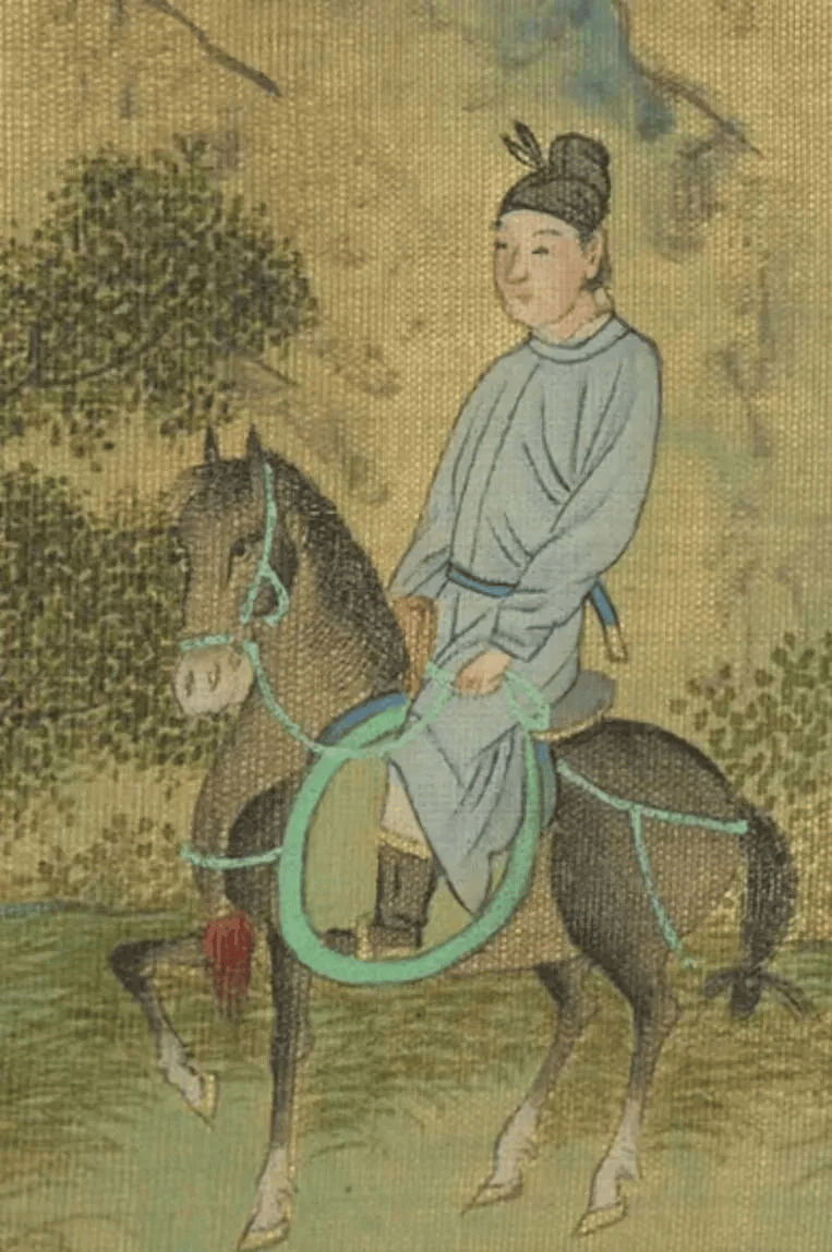 仇英款《江南春图》骑马游人头戴的顺风幞头。