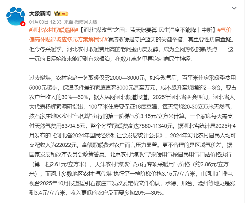 这场寒冬中的民生难题暴露出成本分担与保障机制的多重失衡,一方面,气价存在明显的"区域差异",另一方面,补贴快速退坡忽视了农村群众的收入承受能力。再加上农村房屋普遍保温性能差、气源供应时有波动等现实短板,共同导致"政策初衷"与"群众体感"之间出现明显落差。