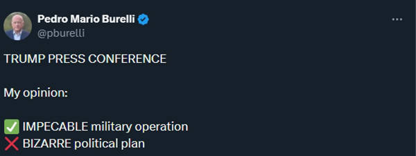 委内瑞拉反对派人士、委国家石油公司前董事佩德罗·布雷利(Pedro Burelli)4日在社媒平台X上直言,军事行动本身或许“无可挑剔”,但特朗普提出的后续政治安排“荒谬至极”(bizarre),同时呼吁美国国务卿鲁比奥等人尽快出面澄清这一“不可接受的情况”(unacceptable situation)。