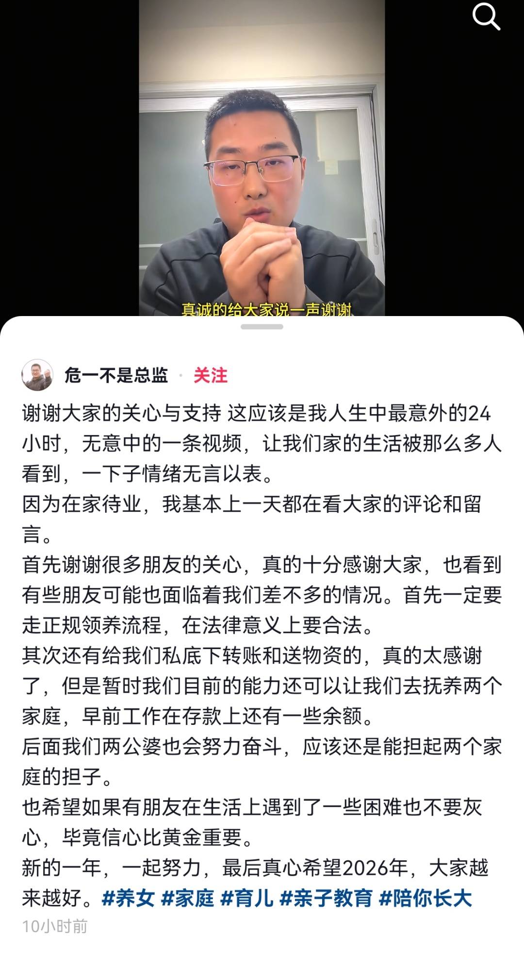 1月3日,危一发布最新视频感谢大家的关心与支持,他表示新的一年会努力奋斗,也希望如果有朋友在生活上遇到了一些困难也不要灰心。“新的一年,一起努力,最后真心希望2026年,大家越来越好”。