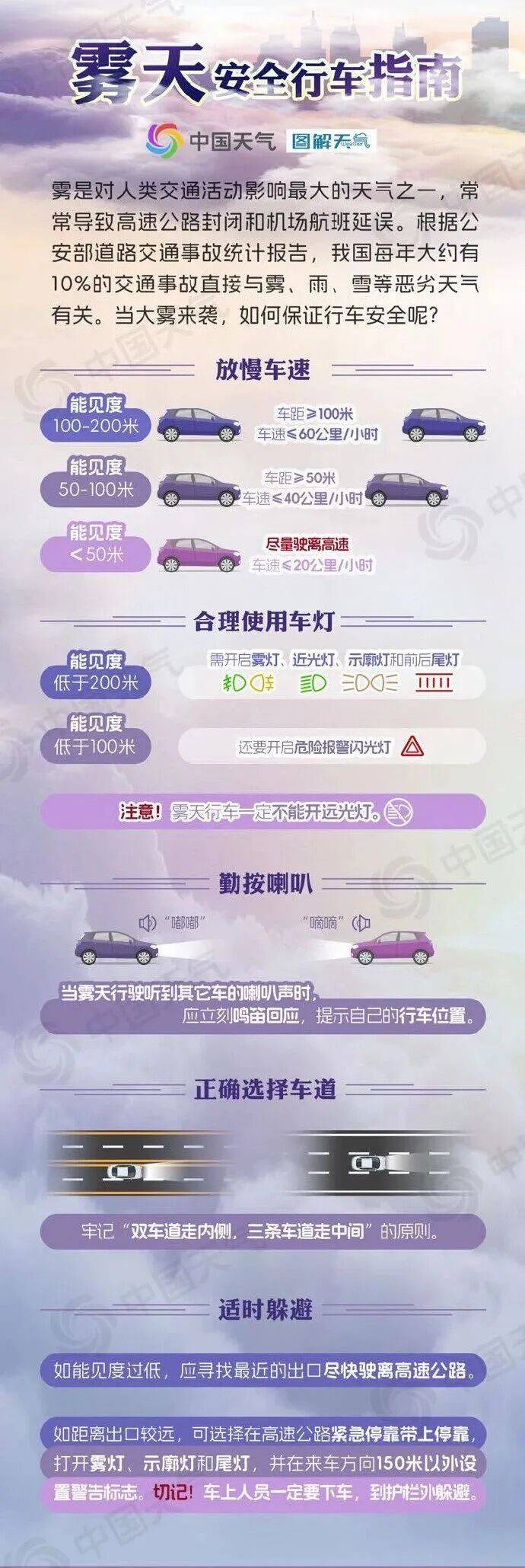 大雾是我国秋冬季较为常见的灾害性天气之一,具有出现几率高、发生范围广、危害程度大等特点。雾天行车有哪些注意事项?一起来看。