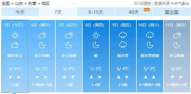 4日下午到5日白天,德州、聊城和鲁南地区天气阴局部有小雨或雨夹雪转多云,其他地区天气晴间多云;鲁西北和鲁中地区4日夜间到5日早晨有雾或轻雾。半岛地区北风4级阵风5~6级,其他地区北风转南风2~3级。