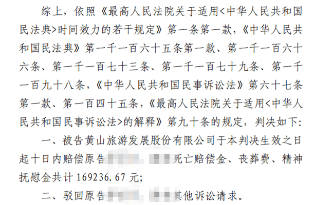 判决结果显示:一、被告黄山旅游发展股份有限公司于本判决生效之日起十日内赔偿原告死亡赔偿金、丧葬费、精神抚慰金共计169236.67元;二、驳回原告其他诉讼请求。