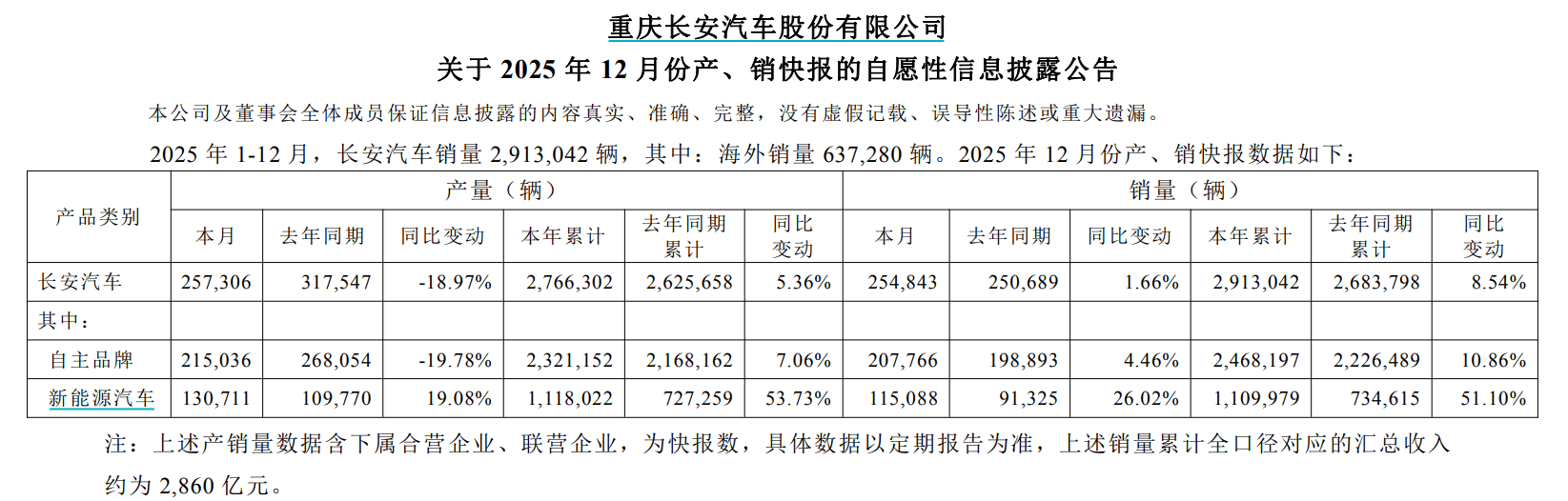 12月份,长安汽车产量为25.73万辆,同比下降18.97%;销量为25.48万辆,同比增长1.66%。其中,自主品牌产量为21.5万辆,同比下降19.78%;销量为20.78万辆,同比增长4.46%。新能源汽车产量为13.07万辆,同比增长19.08%;销量为11.51万辆,同比增长26.02%。