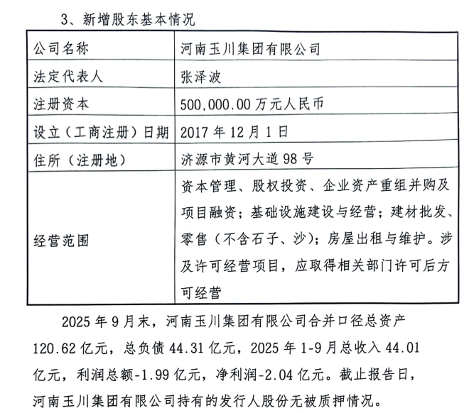 根据公告,河南玉川集团由河南豫光集团全资持股,注册资本为50亿元。2025年9月末,河南玉川集团有限公司合并口径总资产120.62亿元,总负债44.31亿元,2025年1-9月总收入44.01亿元,利润总额-1.99 亿元,净利润-2.04亿元。
