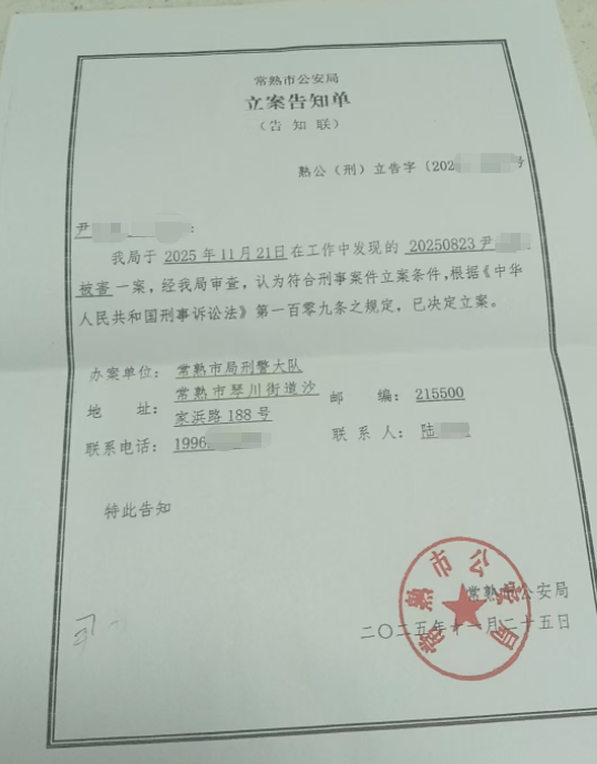 红星新闻记者拿到的一份立案告知单显示,2025年11月25日,常熟市公安局就三岁女童尹某某被害一案刑事立案,办案单位为常熟市刑警大队。