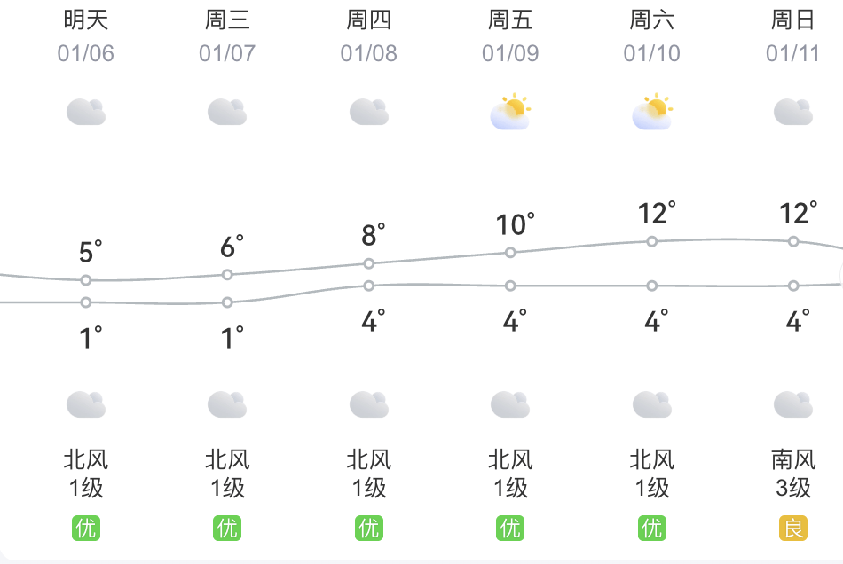 1月11日夜间到12日白天,阴天,主城区气温6~11℃。