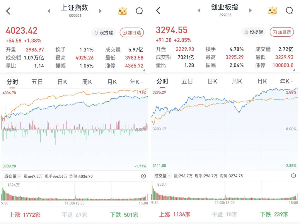 至收盘,上证综指涨1.38%,报4023.42点;科创50指数涨4.41%,报1403.41点;深证成指涨2.24%,报13828.63点;创业板指涨2.85%,报3294.55点。