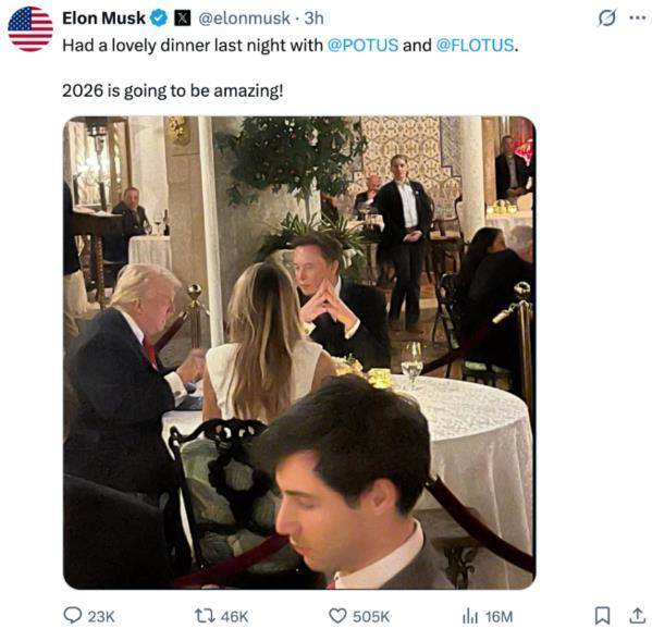 据环球网消息,世界首富埃隆·马斯克当地时间1月4日在社交平台X上发文称,他于3日晚与美国总统特朗普和美国第一夫人梅拉尼娅·特朗普“共进美好晚餐”,并配上一张三人一起用餐的照片。